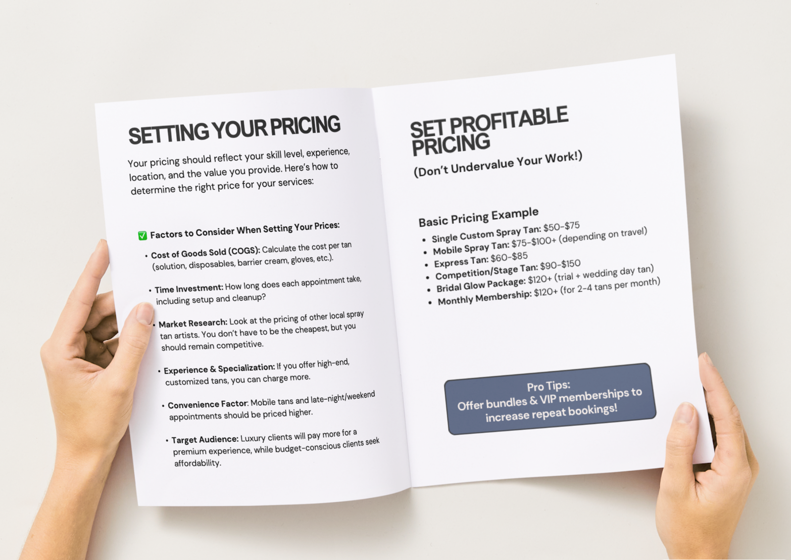 The Spray Tan Pricing Guide is your “finally-I-get-it” moment — the resource that helps you stop guessing, stop undercharging, and stop letting fear make your decisions. Because the truth is: